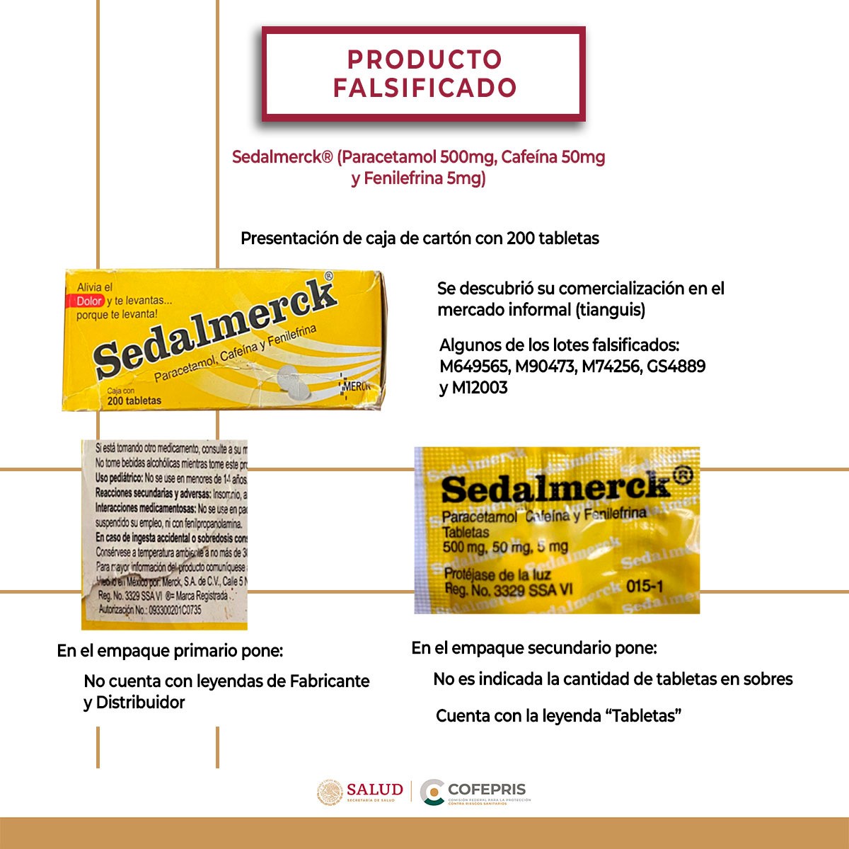 El último producto falsificado es Sedalmerck (paracetamol 500mg, cafeína 50mg y fenilefrina 5mg) en presentación caja de cartón con 200 tabletas. Los lotes irregulares son M649565, M90473, M74256, GS4889 y M12003.