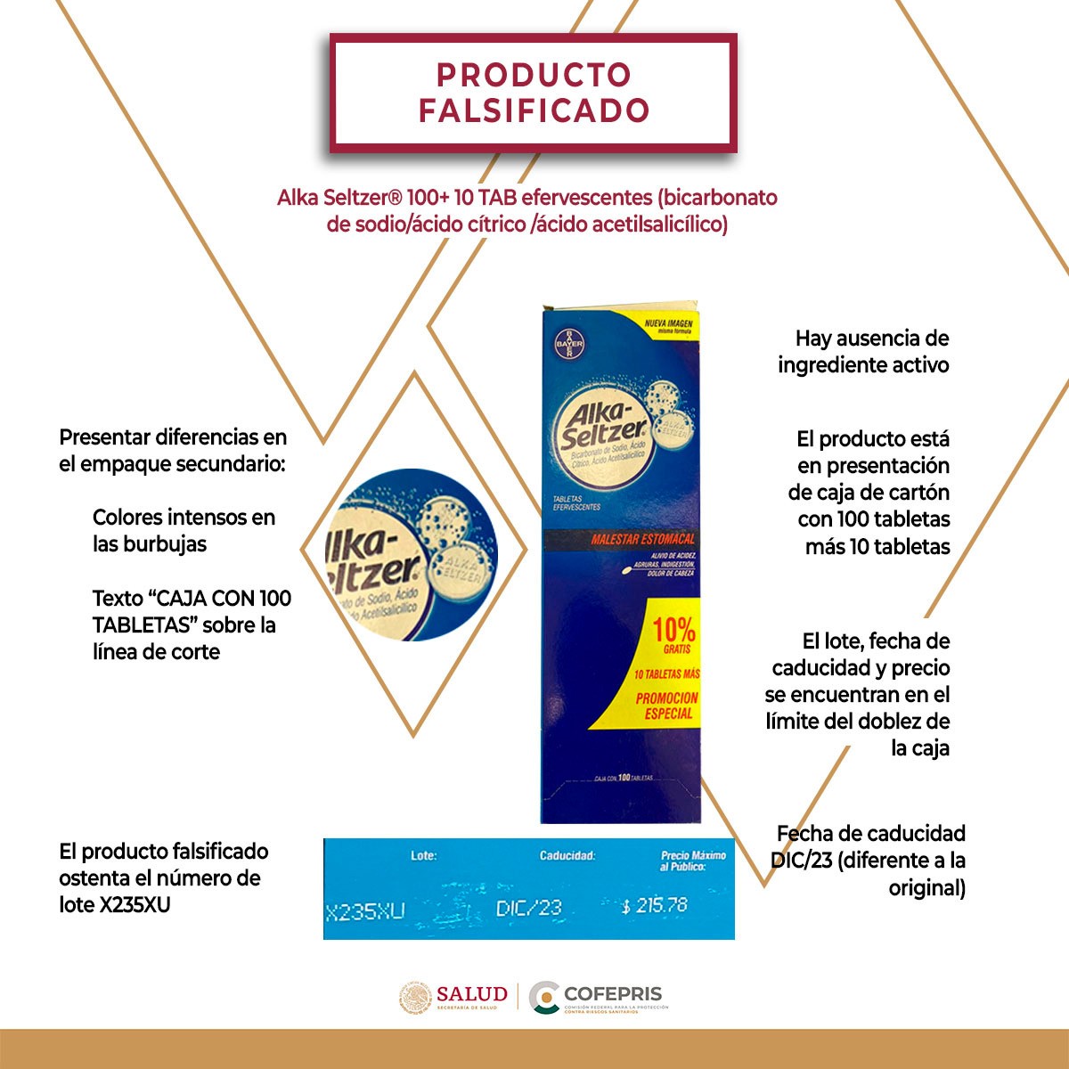 El tercer fármaco falsificado es Alka Seltzer 100+10 TAB efervescentes (bicarbonato de sodio/ácido cítrico/ácido acetilsalicílico), en presentación de 100 tabletas más 10 tabletas, con número de lote X235XU y caducidad diciembre de 2023; sin embargo, la caducidad original es septiembre de 2020.
