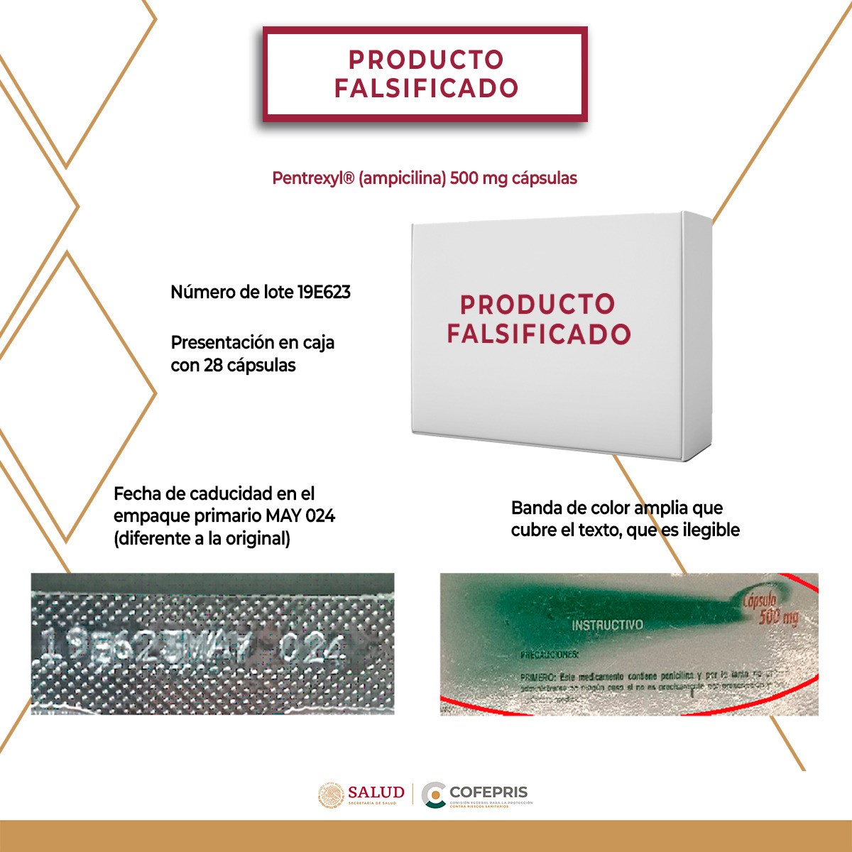 El primer medicamento falsificado es Pentrexyl (ampicilina) 500 mg, con número de lote 19E623 y fecha de caducidad mayo de 2024, en presentación de caja con 28 cápsulas. La empresa Aspen México reportó a esta autoridad que dicho número de lote presentaba fecha de caducidad original mayo 2021.