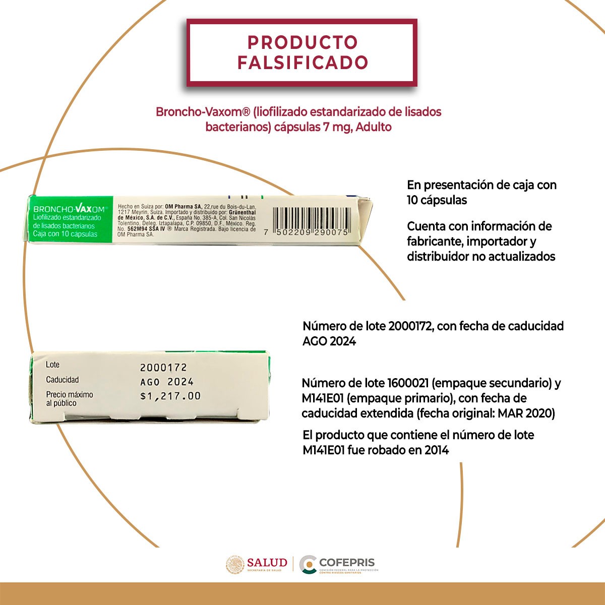 El segundo medicamento falsificado es Broncho-Vaxom (liofilizado estandarizado de lisados bacterianos) en presentación de 10 cápsulas de 7 mg para adulto; con números de lote 2000172 y 1600021, ambos en el empaque secundario, y M141E01 en el empaque primario.