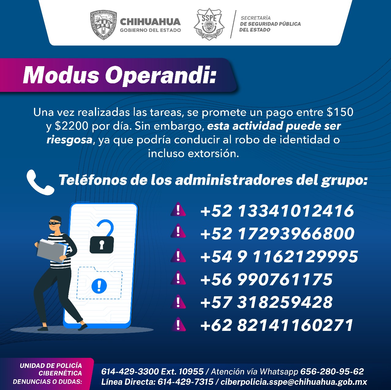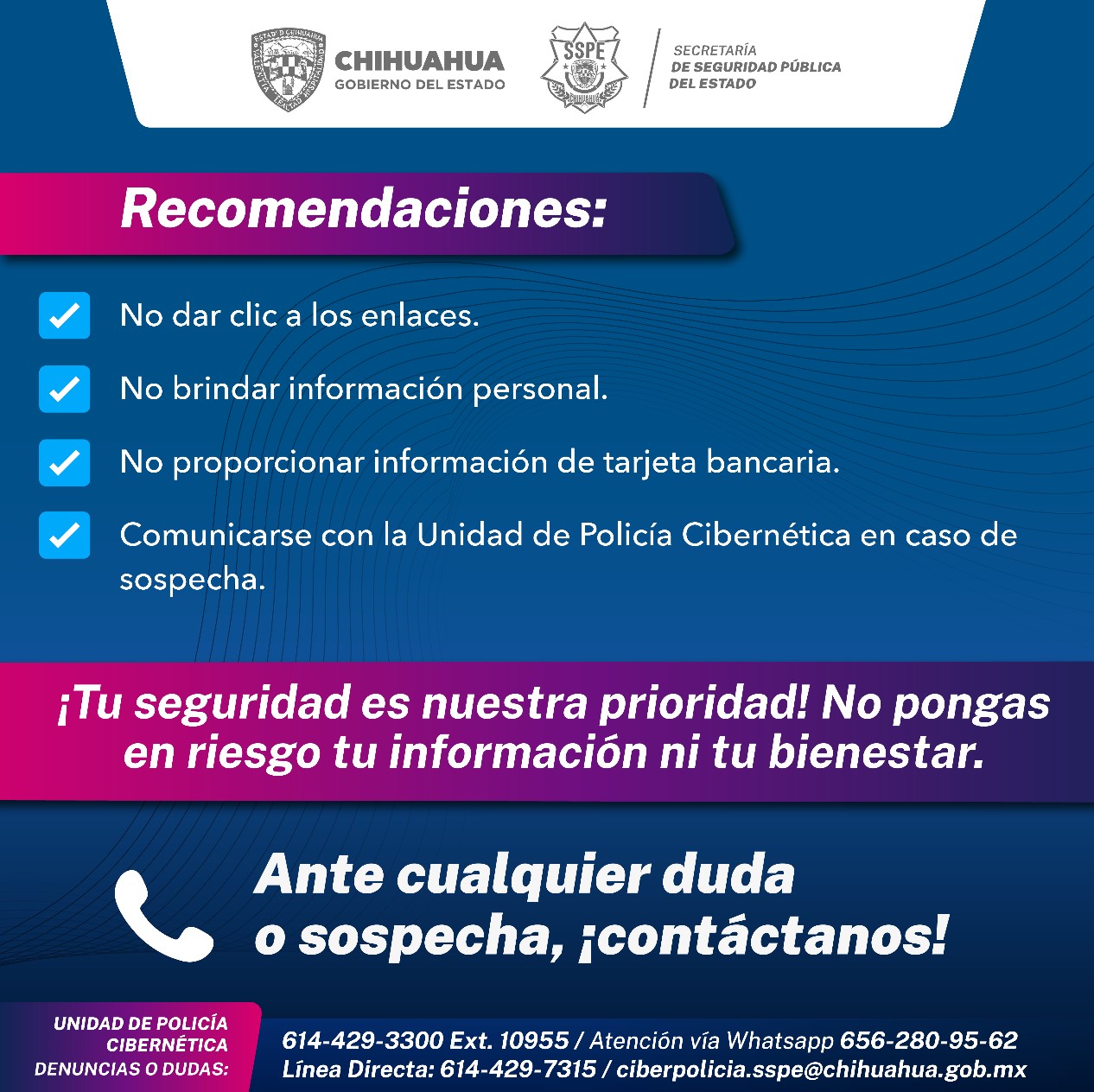 Ante cualquier duda o situación sospechosa de amenaza cibernética, se invita a la ciudadanía a contactar a la Unidad de Policía Cibernética a través del número telefónico 614-429-3300 ext. 10955
