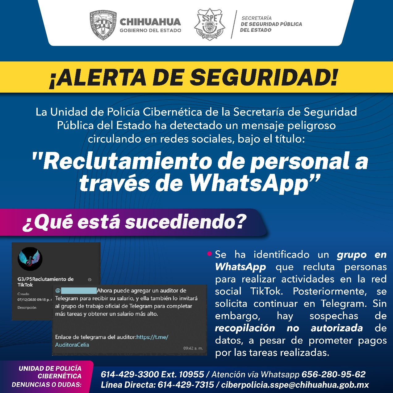 Chihuahua, Chih.- La Unidad de Policía Cibernética de la Secretaría de Seguridad Pública del Estado (SSPE) ha detectado una posible amenaza a través de redes sociales, disfrazada como una actividad de reclutamiento de personas para trabajos en línea.