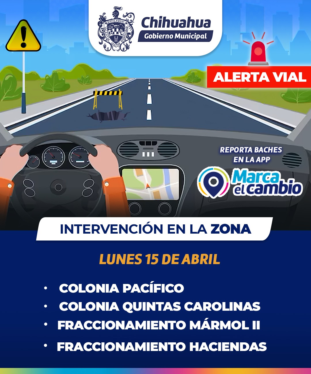 Chihuahua.- El Gobierno Municipal a través de la Dirección de Obras Públicas, emite alerta vial por la intervención de calles en las colonias Pacifico, Quintas Carolinas, y en los fraccionamientos Mármol II y Haciendas, este lunes.