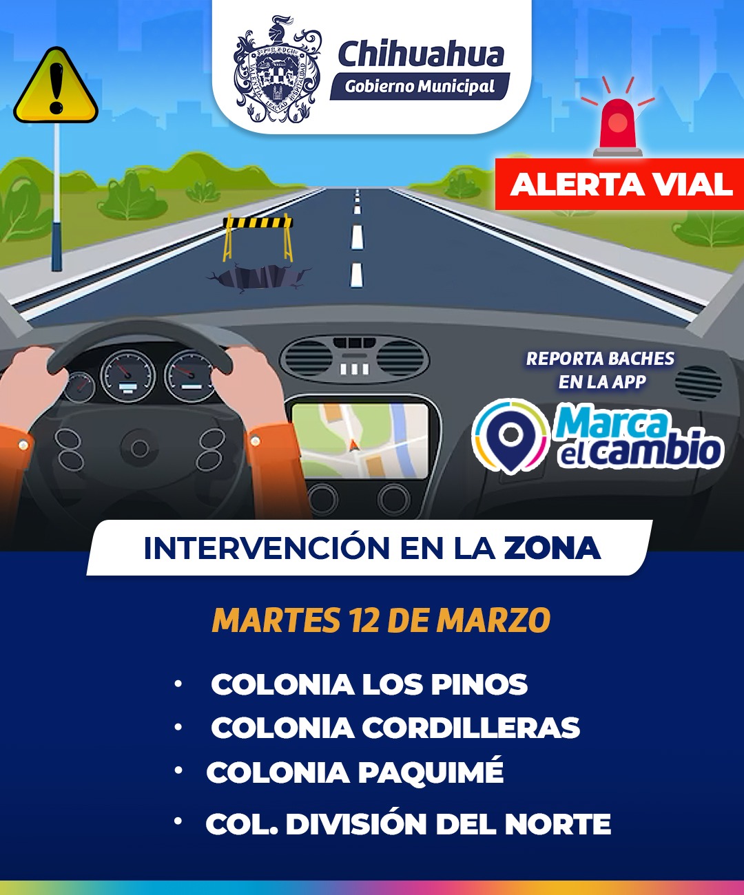 Chihuahua.- El Gobierno Municipal, a través de la Dirección de Obras Públicas, informa las intervenciones viales que se realizarán en las colonias Los Pinos, Cordilleras, Paquimé y División del Norte.