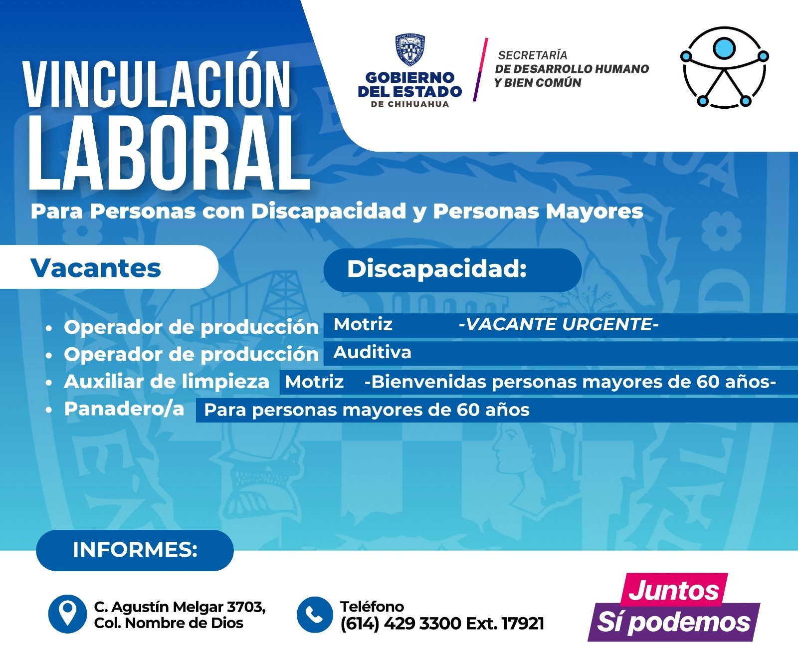 Para mayor información sobre vacantes disponibles, comunicarse al teléfono (614) 429-33-00, extensión 17921, o acudir a las oficinas de la Dirección de Grupos Vulnerables, en avenida Agustín Melgar 3703, colonia Nombre de Dios, de 8:00 a 16:00 horas.