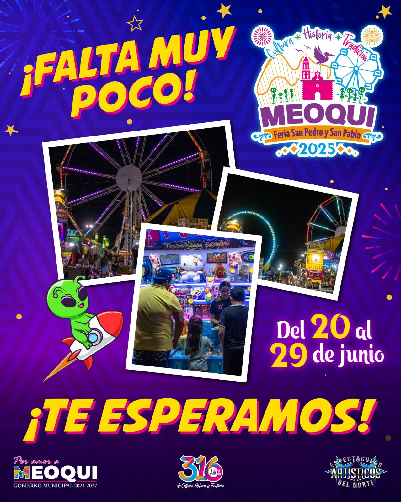 Meoqui.- Este próximo viernes 20 de junio Meoqui dará inicio a las Ferias San Pedro y San Pablo Meoqui 2025 donde se presentarán grandes artistas como Luis Alfonso “El Yaki” y Tropicalisimo Apache, además de contar con una gran variedad de juegos y antojitos para toda la familia.