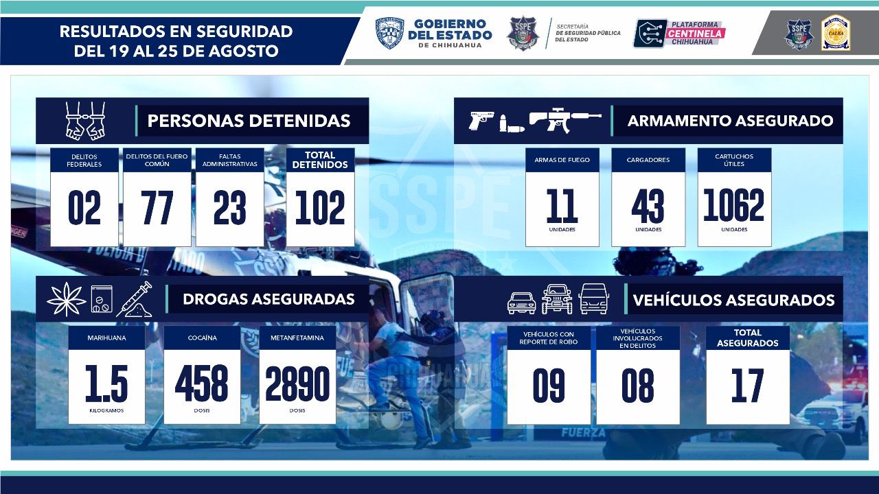 Chihuahua.- La Secretaría de Seguridad Pública del Estado (SSPE) informó que del 19 al 25 de agosto, se llevó a cabo la detención de 102 personas, así como el aseguramiento de diversos artefactos relacionados con la comisión de algún delito en la entidad.