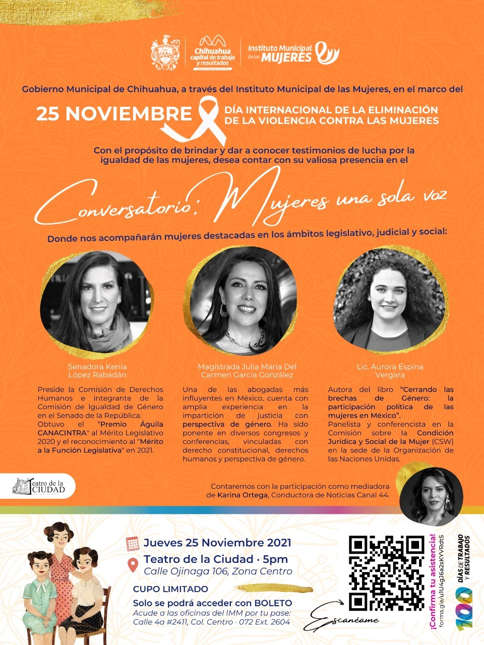 Chihuahua.- El Gobierno Municipal invita a la ciudadanía al conversatorio en el Teatro de la Ciudad, donde participarán la senadora Kenia López Rabadán, presidenta de la Comisión de Derechos Humanos; la magistrada Julia María del Carmen García González con experiencia en la impartición de justicia con perspectiva de género y Aurora Espina Vergara, panelista y conferencista en la comisión sobre la condición jurídica y social de la mujer, en la sede de la ONU.