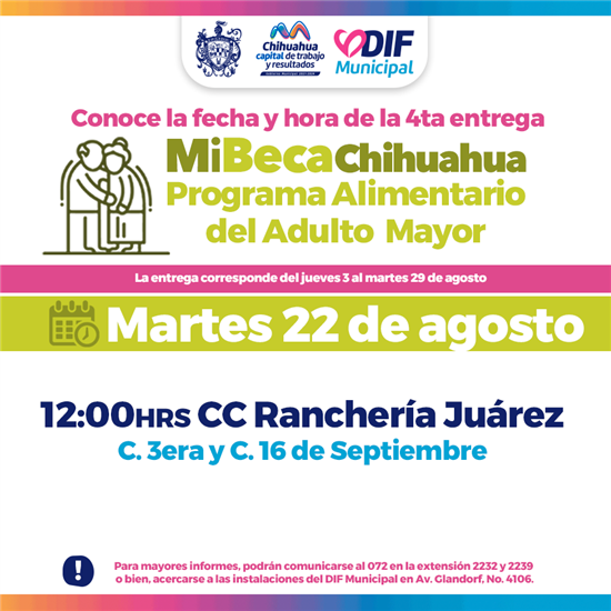 Chihuahua.- Bajo el compromiso del alcalde Marco Bonilla, de trabajar en brindar una mejor calidad a las y los adultos mayores, el DIF Municipal recuerda a la población que este martes 22 de agosto, las y los beneficiarios del Programa Alimentario del Adulto Mayor (PAAM) podrán acudir por su apoyo alimentario al centro comunitario Ranchería Juárez, al sur de la ciudad, a partir de las 12:00 horas.