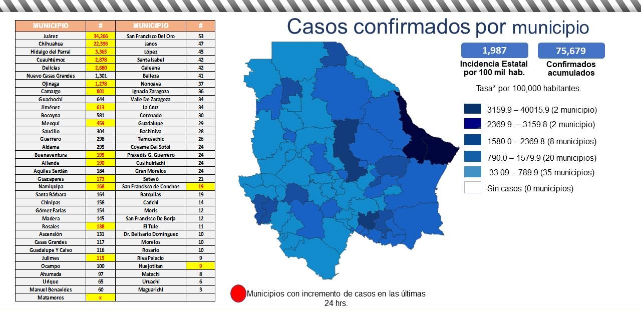Además, el número de personas fallecidas aumentó en 2, que corresponden a Parral y Matamoros, en total se alcanzan ya los 7 mil 814 fallecimientos.