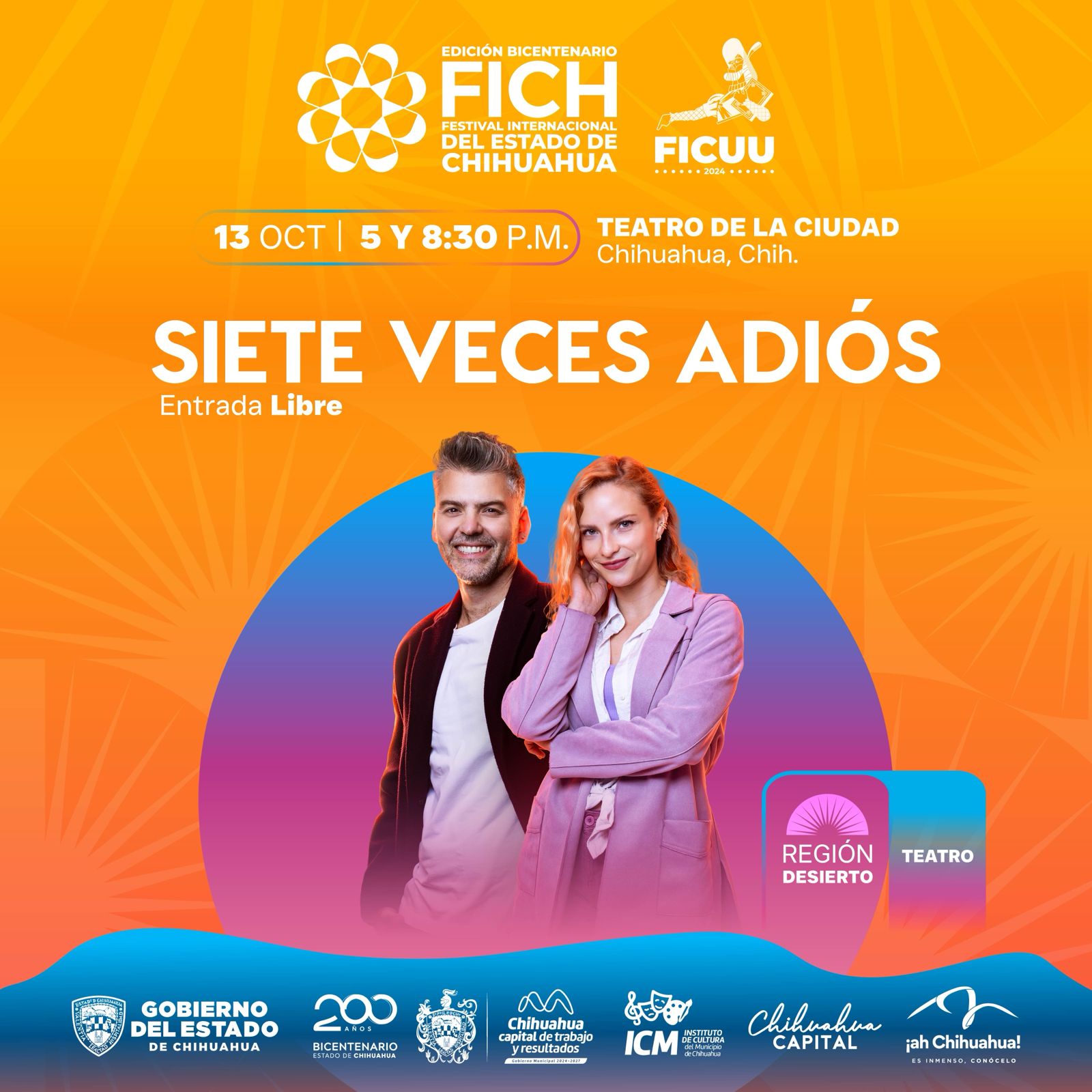 Chihuahua.- El FICH-FICUU 2024 continúa su programación hoy con la obra de teatro “Siete Veces Adiós”, que se presentará en el Teatro de la Ciudad con dos funciones programadas a las 5:00 pm y 8:30 pm, evento que agotó rápidamente sus boletos desde su entrega el pasado 7 de octubre.