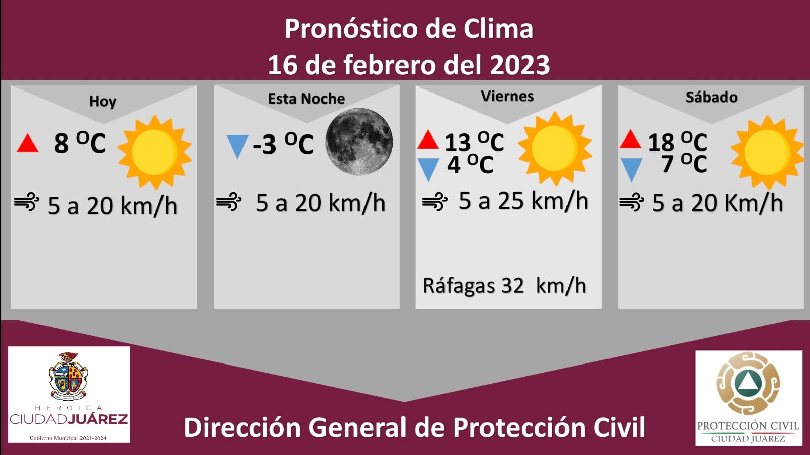 Juárez.- La Dirección General de Protección Civil, con base en informes del Servicio Meteorológico Nacional, pronostica una temperatura máxima de 8 grados Celsius para este jueves, mientras que la mínima será de -3 °C por la noche, informó Roberto Briones Mota, titular de la dependencia.