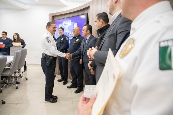 Para la entrega simbólica de las constancias estuvieron también: Néstor Alfredo Salmón Rubio, director de la Policía Municipal de Meoqui; Julio César Salas González, sub director táctico de la Policía Municipal de Chihuahua; José Roberto Ortiz de la Rosa, sub director de Despliegue Operativo; Simeón Esparza Peynado, sub director de Formación y Luis Ramón Corral Torresdey, coordinador de Bomberos y Joel Estrada Castillo, encargado de despacho de Protección Civil.