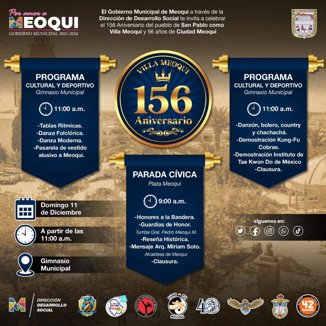 Este evento está organizado por el Gobierno Municipal de Meoqui a través de la Dirección de Desarrollo Social, quienes hacen la invitación extensiva a la población para que asistan a celebrar el 156 Aniversario del pueblo de San Pablo como Villa Meoqui y 56 años de Ciudad Meoqui.