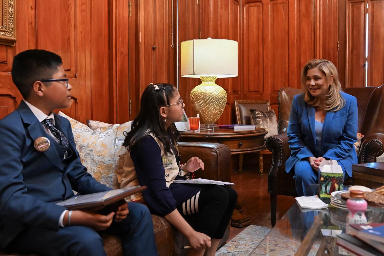 Chiuhuahua, Chih.- La Gobernadora del Estado y el Gobernador Infantil, Jesús Molina Mendoza, sostuvieron una plática con Valentina Vega, la reportera infantil de El Heraldo de Chihuahua, como parte de las actividades para celebrar el Día de la Niñez.
