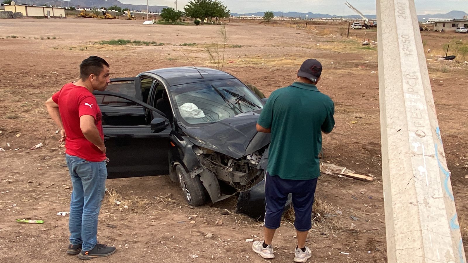 Chihuahua.- Un fuerte choque de un vehículo, Ford Figo, perteneciente a la plataforma Didi, chocó contra un poste de la Comisión Federal de Electricidad en la colonia Punta los Naranjos, al oriente de la capital.