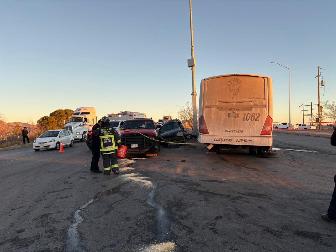 Chihuahua.- El choque entre un camión urbano y una camioneta Jeep Cherokee dejó como saldo una persona sin vida, debido al impacto.