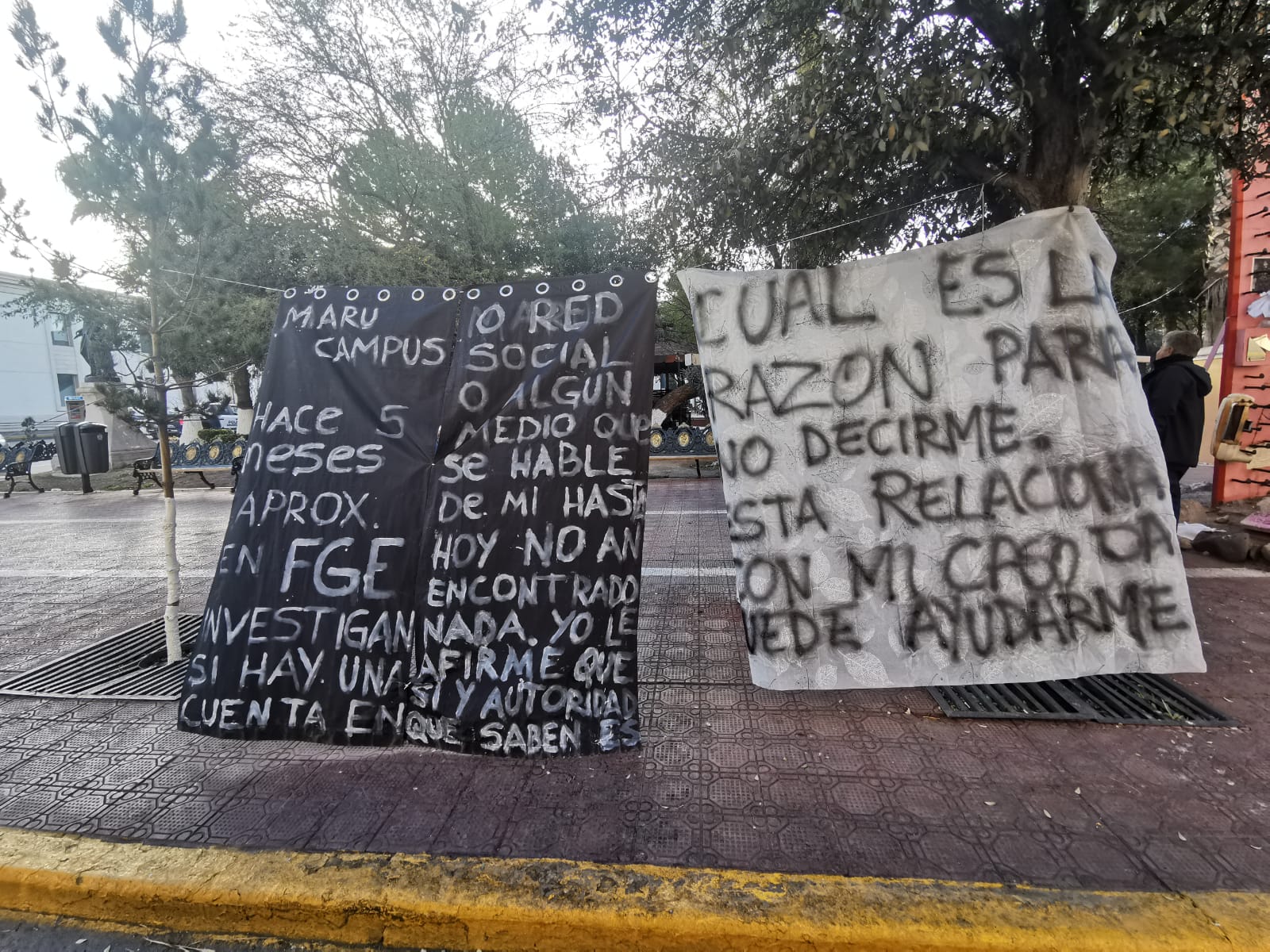 “Maru Campos hace 5 meses aprox, en FGE investigan si hay una cuenta en (…) o red social o algún medio que se hable de mi, hasta hoy no han encontrado nada. Yo le firme que si y autoridad que saben es”, se lee en dos lonas.