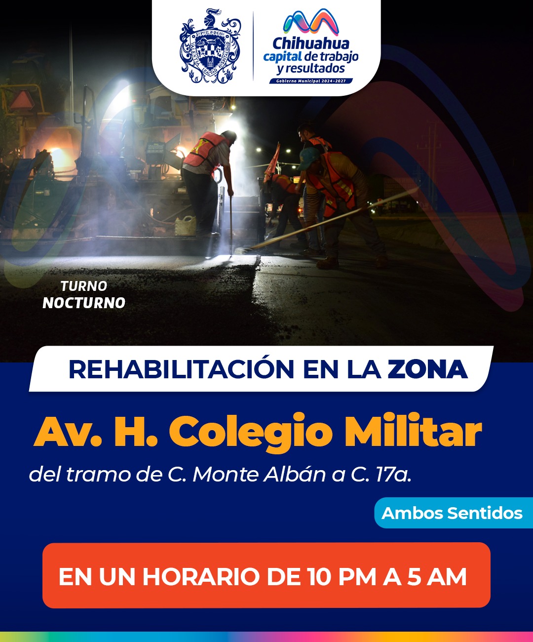 Chihuahua.- El Gobierno Municipal que preside el alcalde Marco Bonilla por medio de la Dirección de Obras Públicas, informa que a partir del domingo 20 de octubre iniciarán los trabajos de recarpeteo de la avenida Heroico Colegio Militar en el tramo de calle Monte Albán a calle 17 en ambos sentidos.