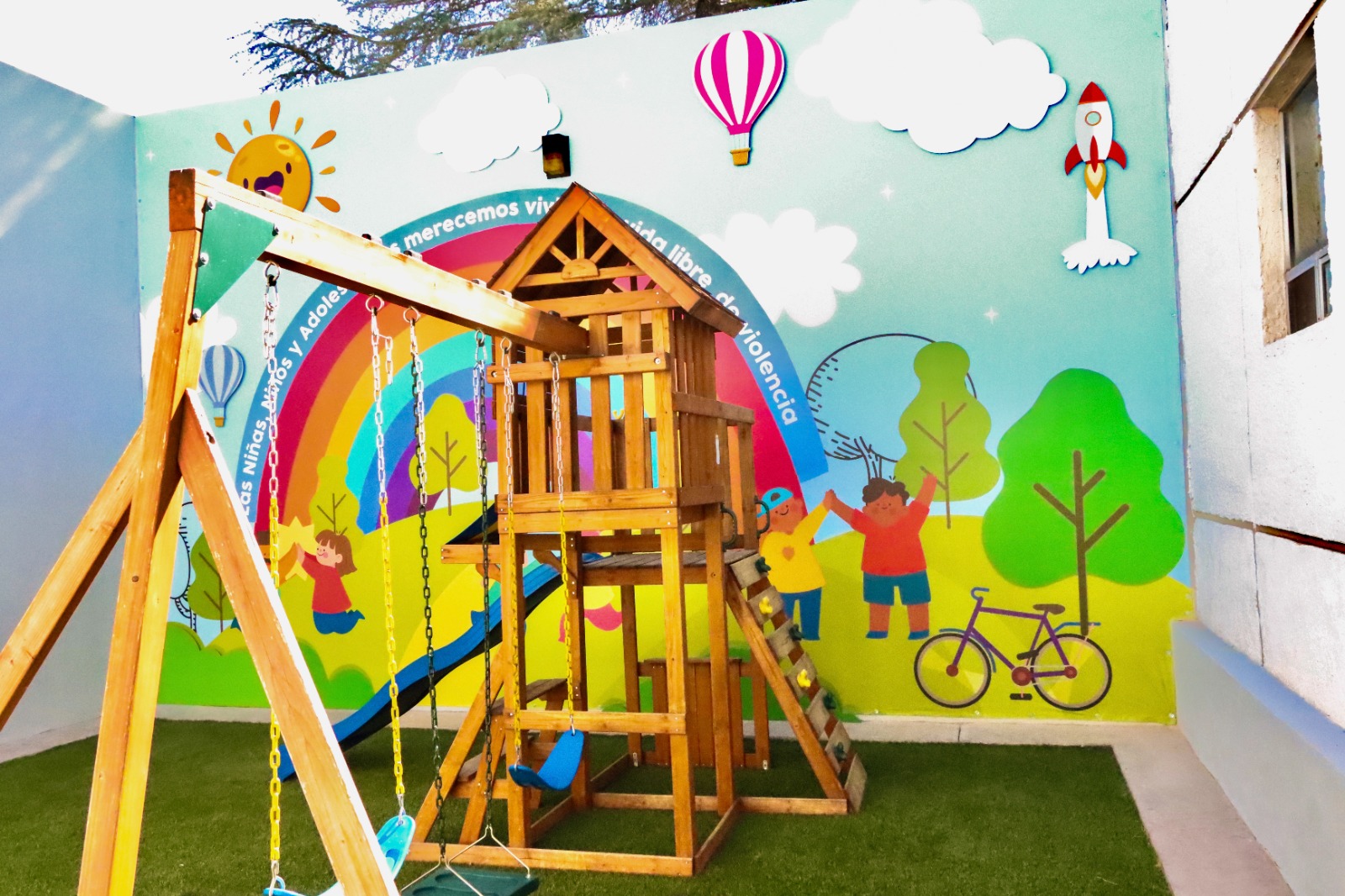 Tanto el mural, como el área lúdica de la UAVI, fueron otorgados por el DIF Municipal, con la finalidad de que las niñas, niños y adolescentes que llegan a este espacio, permanezcan en un lugar adecuado y agradable, donde puedan jugar, convivir con otros pequeños y desarrollar sus destrezas creativas, mientras que las madres de familia realizan sus gestiones pertinentes, tal como lo indica la leyenda del mural: “Las Niñas, Niños y Adolescentes merecemos vivir una vida libre de violencia”.
