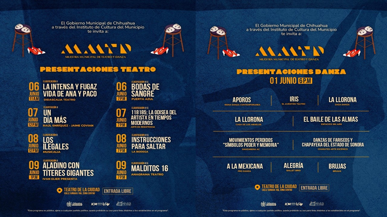 Chihuahua.- El Gobierno Municipal de Chihuahua, a través del Instituto de Cultura del Municipio, da a conocer la cartelera de la Muestra Municipal de Teatro y Danza 2024, que se llevará a cabo en el Teatro de la Ciudad ubicado en calle Ojinaga, este evento promete deleitar a la comunidad con una variedad de espectáculos teatrales y de danza.