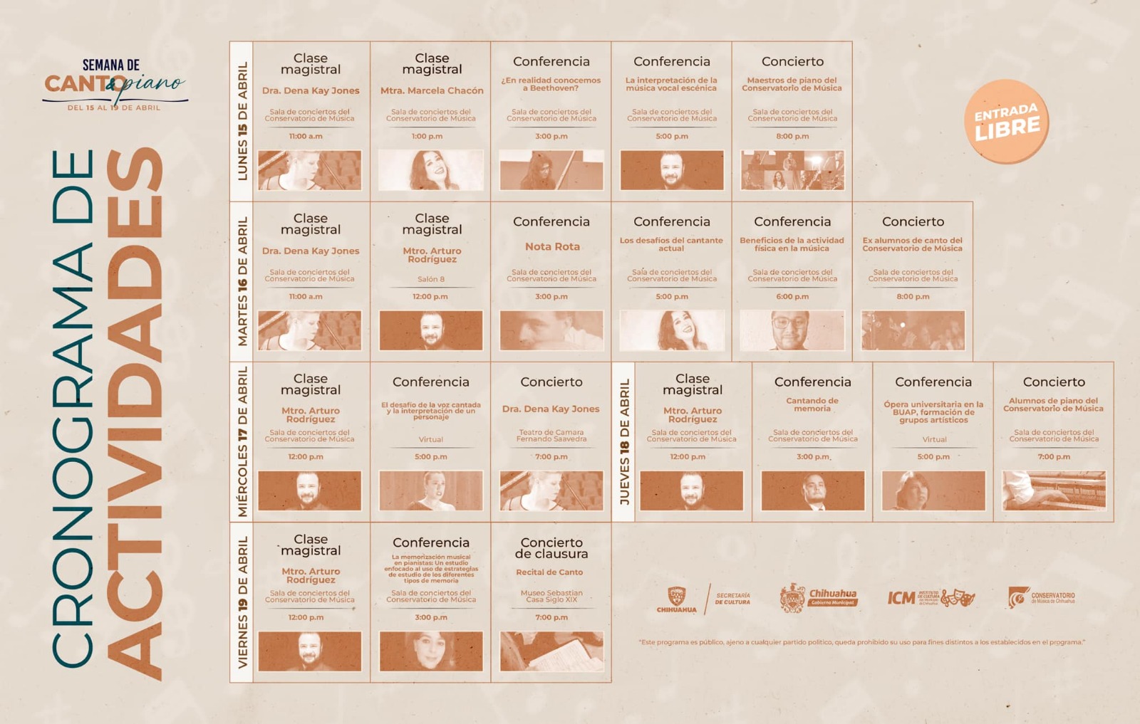 Del 15 al 19 de abril del presente año, el Conservatorio de Música de Chihuahua ofrecerá una serie de actividades presenciales y virtuales con la participación de maestros de talla internacional, entre ellos: doctora Dena Kay Jones de UTEP y el maestro Arturo Rodríguez de la UAdeC, con el objetivo de enriquecer el aprendizaje y la experiencia musical de los estudiantes.