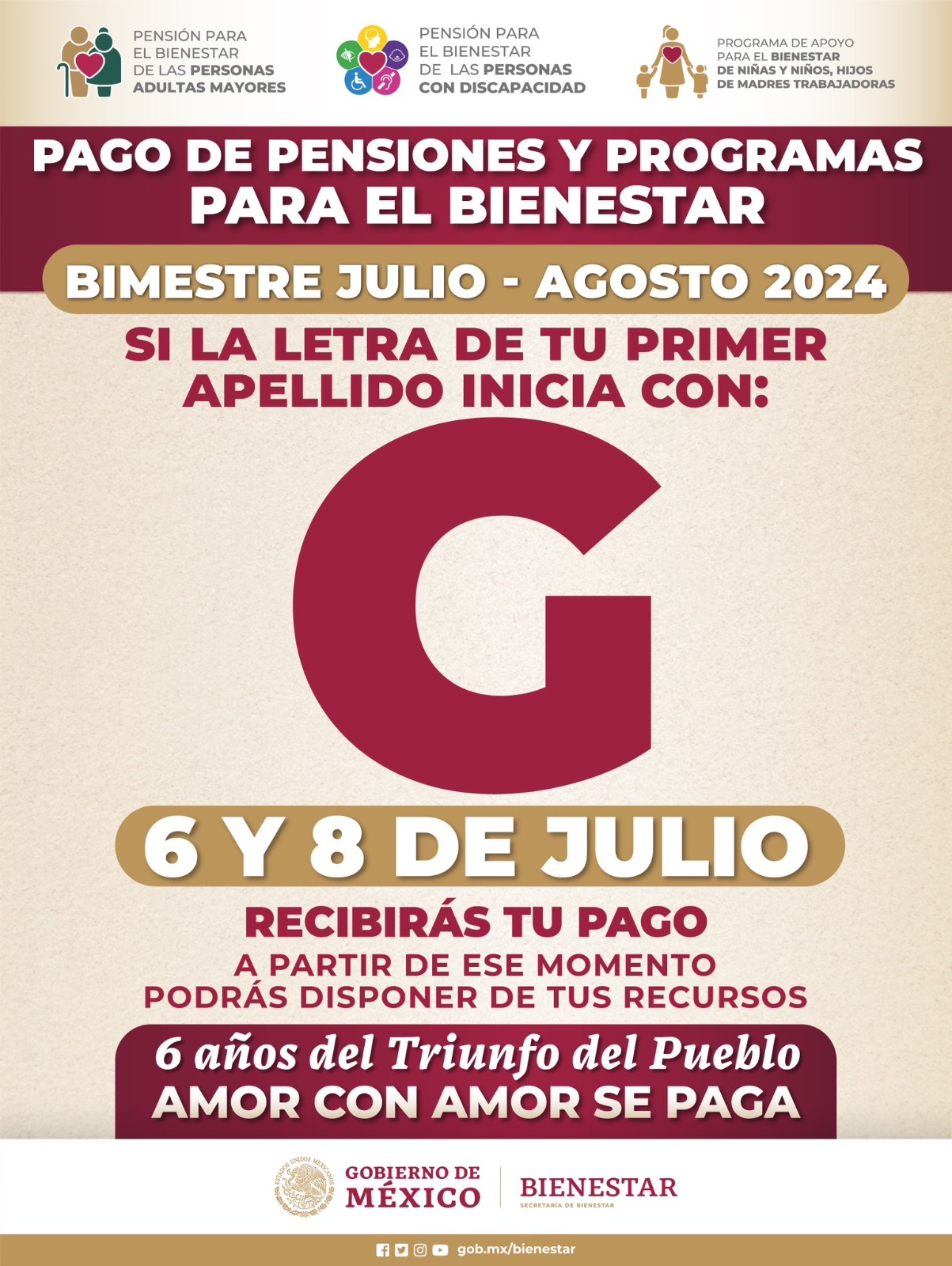 Recordó que se trata de la dispersión bancaria de manera directa y sin intermediarios correspondiente al bimestre julio-agosto a través de la tarjeta del Banco del Bienestar, por lo que su pago se encuentra garantizado, y no es necesario acudir antes de la fecha programada.
