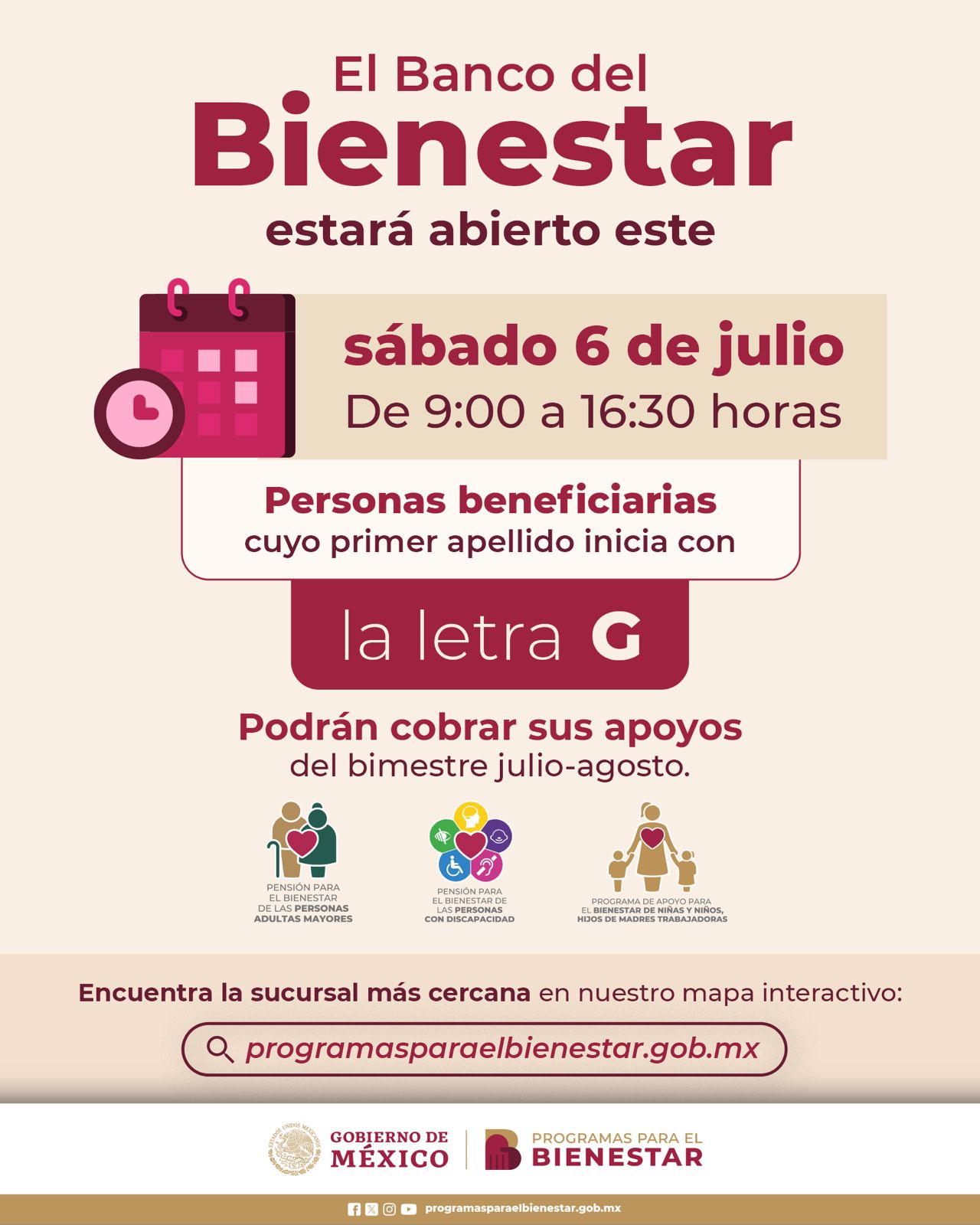 Explicó que de acuerdo con el calendario establecido, este sábado 6 de julio corresponde a quienes su primer apellido inicia con la letra G y el sábado 13 de julio a las letras N, Ñ, O, P, Q.