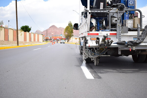 Chihuahua.- El Gobierno Municipal a través de la Dirección de Obras Públicas continúa con las labores de mantenimiento y colocación de señalamiento vial por medio de pintura en calles y avenidas, para brindar seguridad a quienes manejan y circulan por las vialidades de la ciudad.