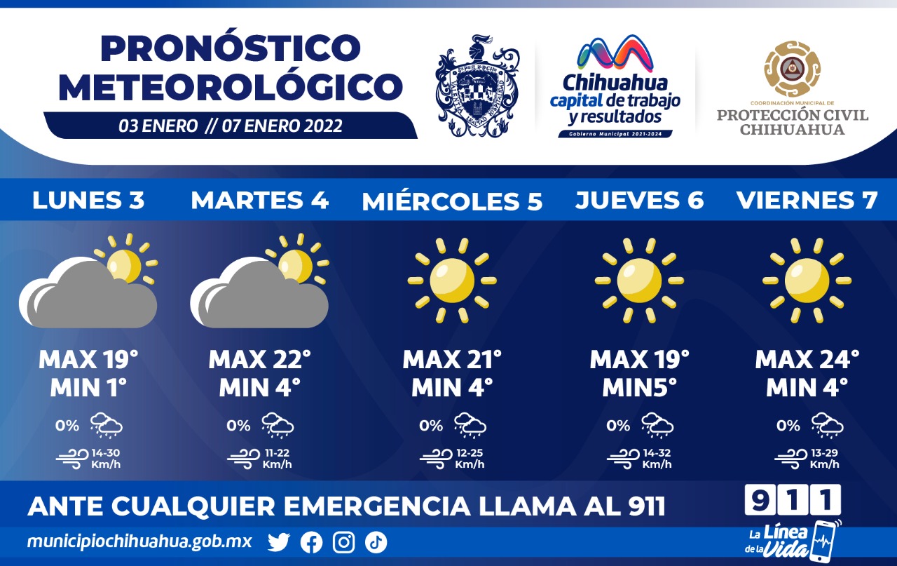 De acuerdo al pronóstico que emite el Servicio Meteorológico Nacional de CONAGUA, la temperatura máxima para hoy lunes será de 19°C; para el martes será de 22°C y de 4°C la mínima; el miércoles se esperan 21°C y 4°C, respectivamente; el jueves la máxima será de 19°C y la mínima de 5°C; en tanto el viernes el termómetro llegará hasta los 24°C como máxima y descenderá a los 4°C.
