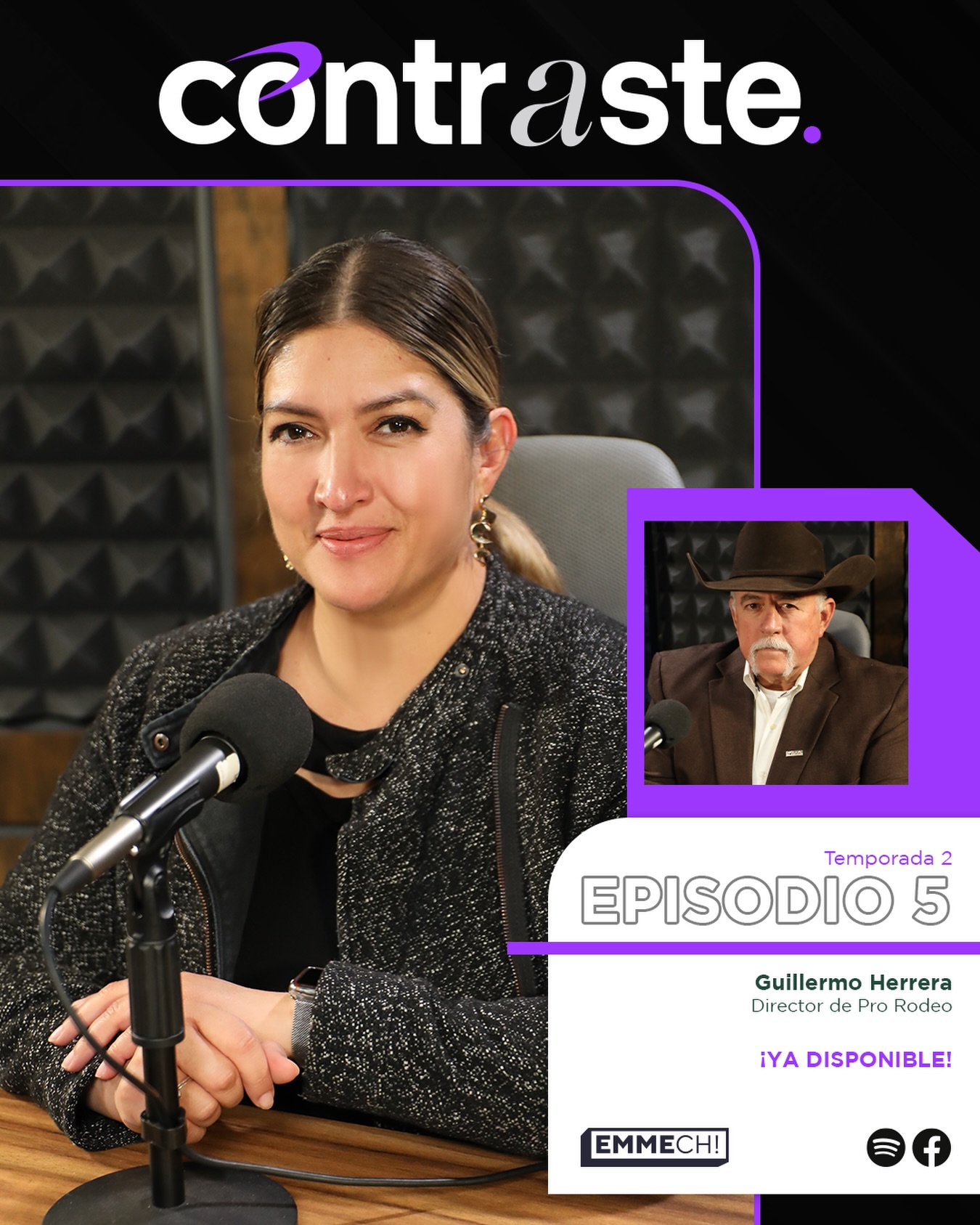 Chihuahua.- En un nuevo episodio de Contraste Podcast, a través de EMME Channel, nuestra host, Angélica Delgado, tuvo la oportunidad de compartir con la audiencia una entrevista con el director de Pro Rodeo, Guillermo Herrera, quien compartió las bases para llegar hasta donde se encuentra hoy, desde sus éxitos, retos y desafíos.
