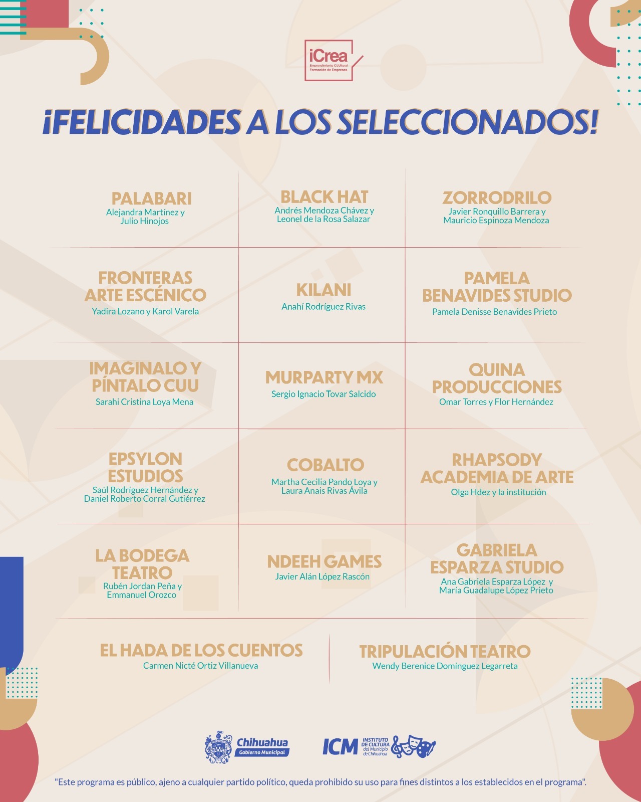 Chihuahua.- El Gobierno Municipal, a través del Instituto de Cultura del Municipio, da a conocer a los seleccionados de la convocatoria “iCrea Emprendimiento Cultural/Formación de Empresas”, este programa, orientado a impulsar, acompañar y promover proyectos de emprendimiento en áreas culturales, creativas y artísticas, se fundamenta en principios de comercio justo, intercambio ético y sostenibilidad.