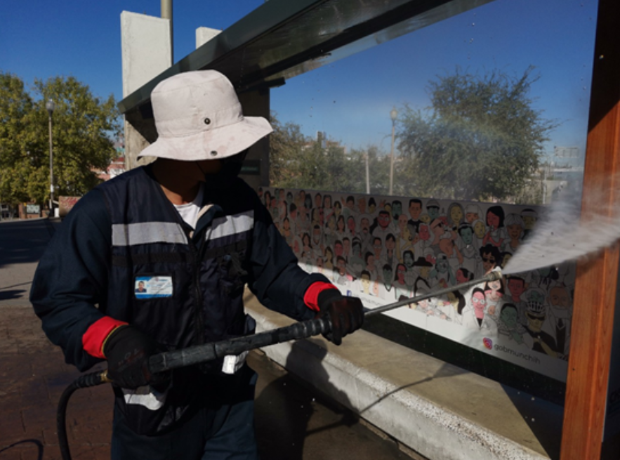 El personal de la Dirección de Mantenimiento Urbano lleva a cabo dichas actividades mediante hidrolavadoras, las cuales rocían un químico especial que limpia y sanitiza las superficies de paradas de camiones y sus alrededores.