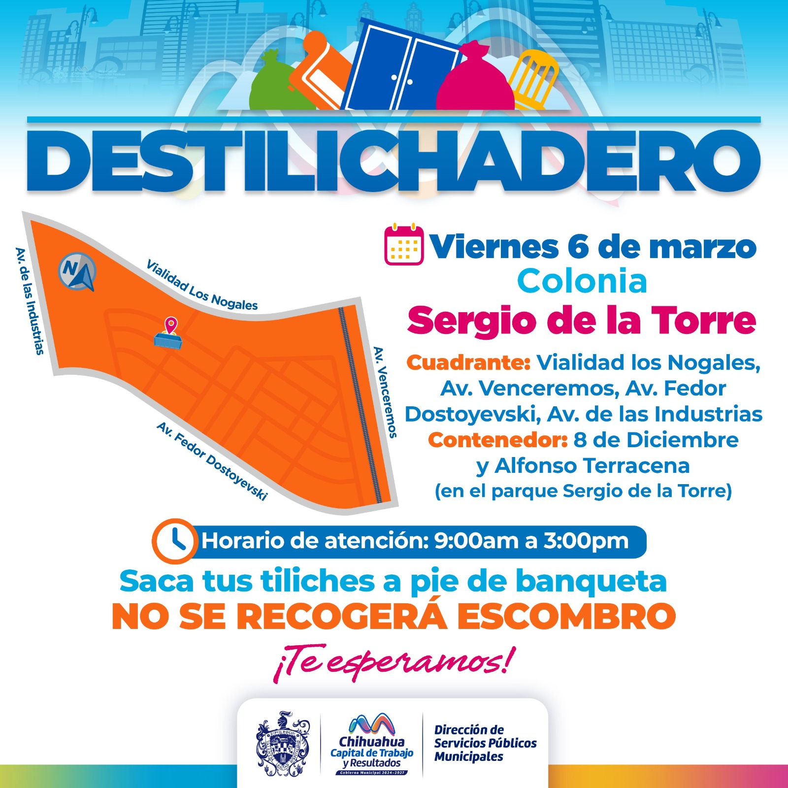 Chihuahua, Chih.- El Gobierno Municipal, a través de la Dirección de Servicios Públicos Municipales, informa a la ciudadanía el cambio de colonia en el programa Destilichadero para este viernes 6 de marzo, el cual se tenía contemplado estuviera en la colonia Infonavit Nacional y se cambiará a la colonia Sergio de La Torre.