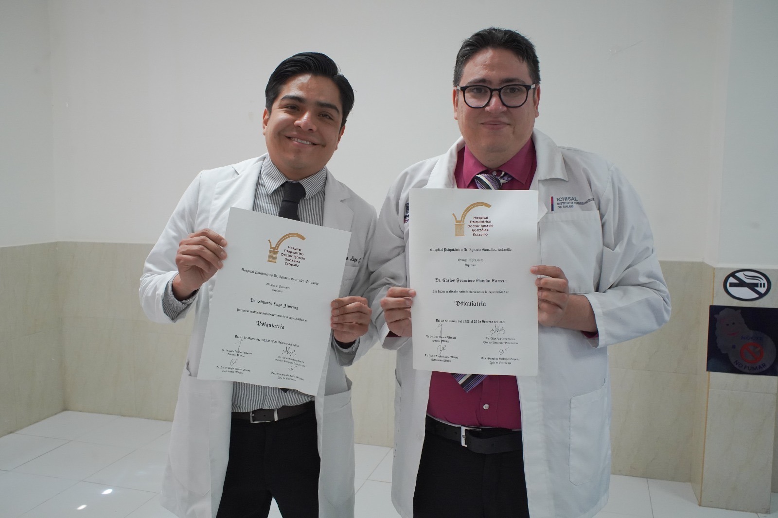 Chihuahua.- Los médicos Carlos Francisco Gaytán Carrera y Eduardo Lugo Jiménez obtuvieron sus respectivos títulos que los acreditan como especialistas en Psiquiatría, luego de concluir su residencia en el Hospital de Salud Mental “Dr. Ignacio González Estavillo”.