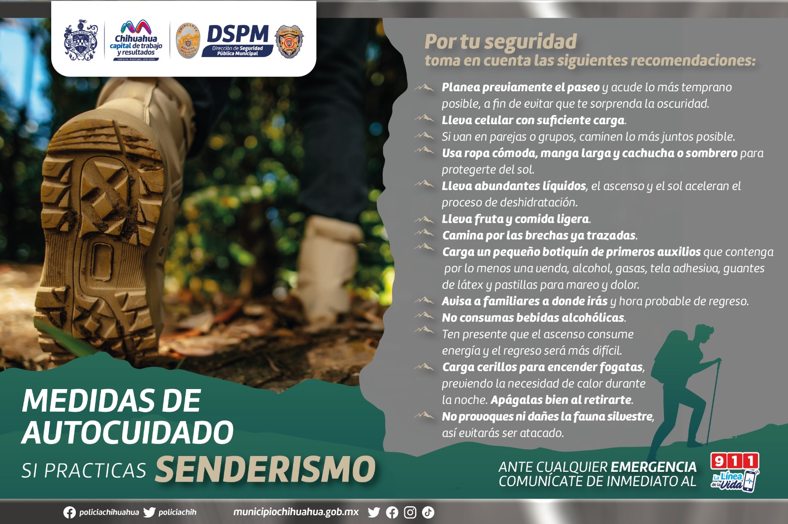 Chihuahua, Chih.- El Gobierno Municipal de Chihuahua, a través del Heroico Cuerpo de Bomberos y Rescate, emite importantes recomendaciones para las y los senderistas o quienes suelen acudir de recreo a cerros u otras áreas naturales, esto con el objetivo de prevenir incidentes que pudieran suscitarse y que pueden causar daños a la salud.