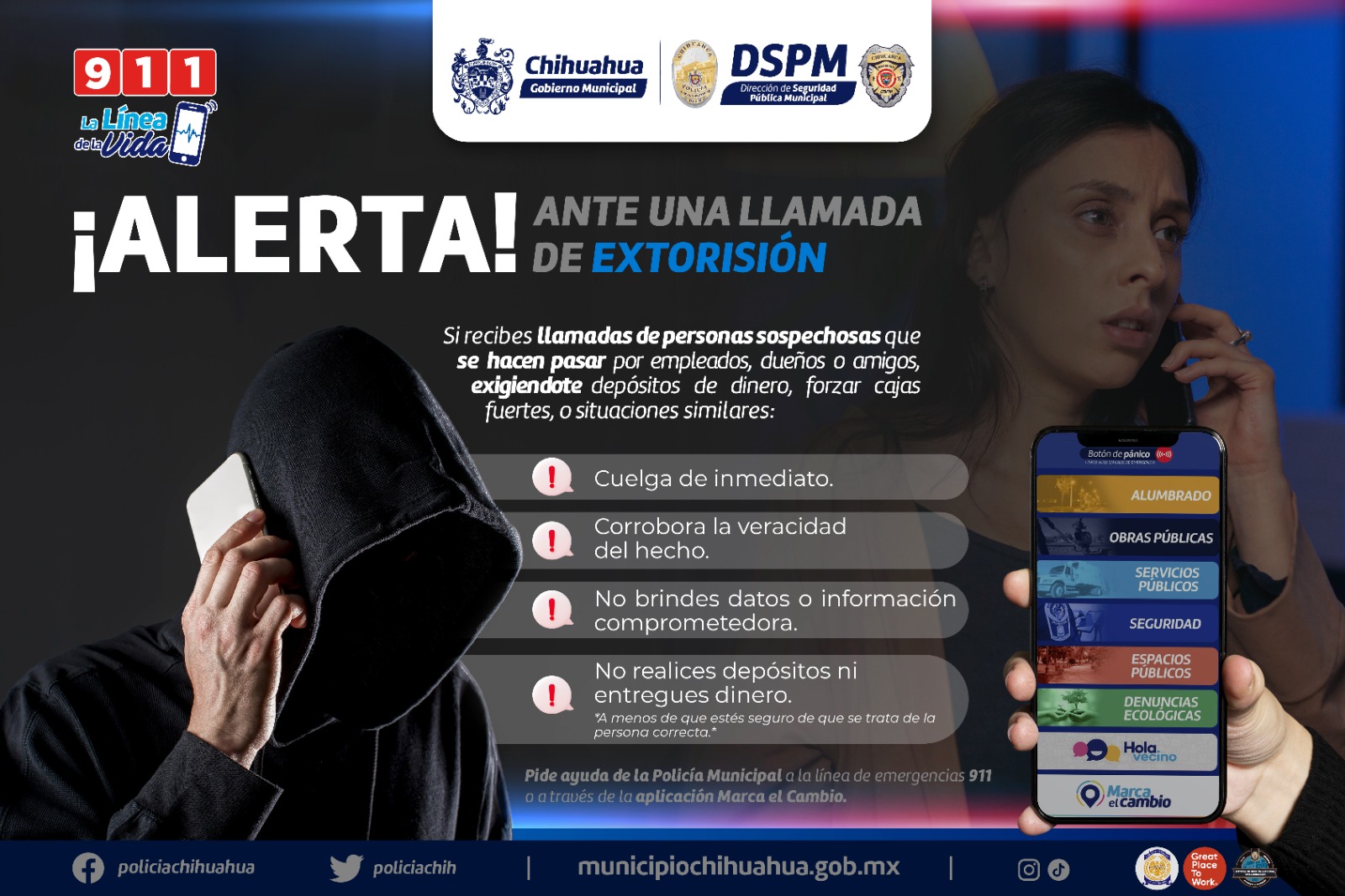 Chihuahua, Chih.- Con el objetivo de informar y prevenir a las y los chihuahuenses sobre personas que buscan extorsionar a través de llamadas telefónicas para obtener dinero de manera fácil, el Gobierno Municipal por medio de su Policía Cibernética, brinda importantes recomendaciones que les ayudarán a evitar caer en las redes de estos delincuentes.