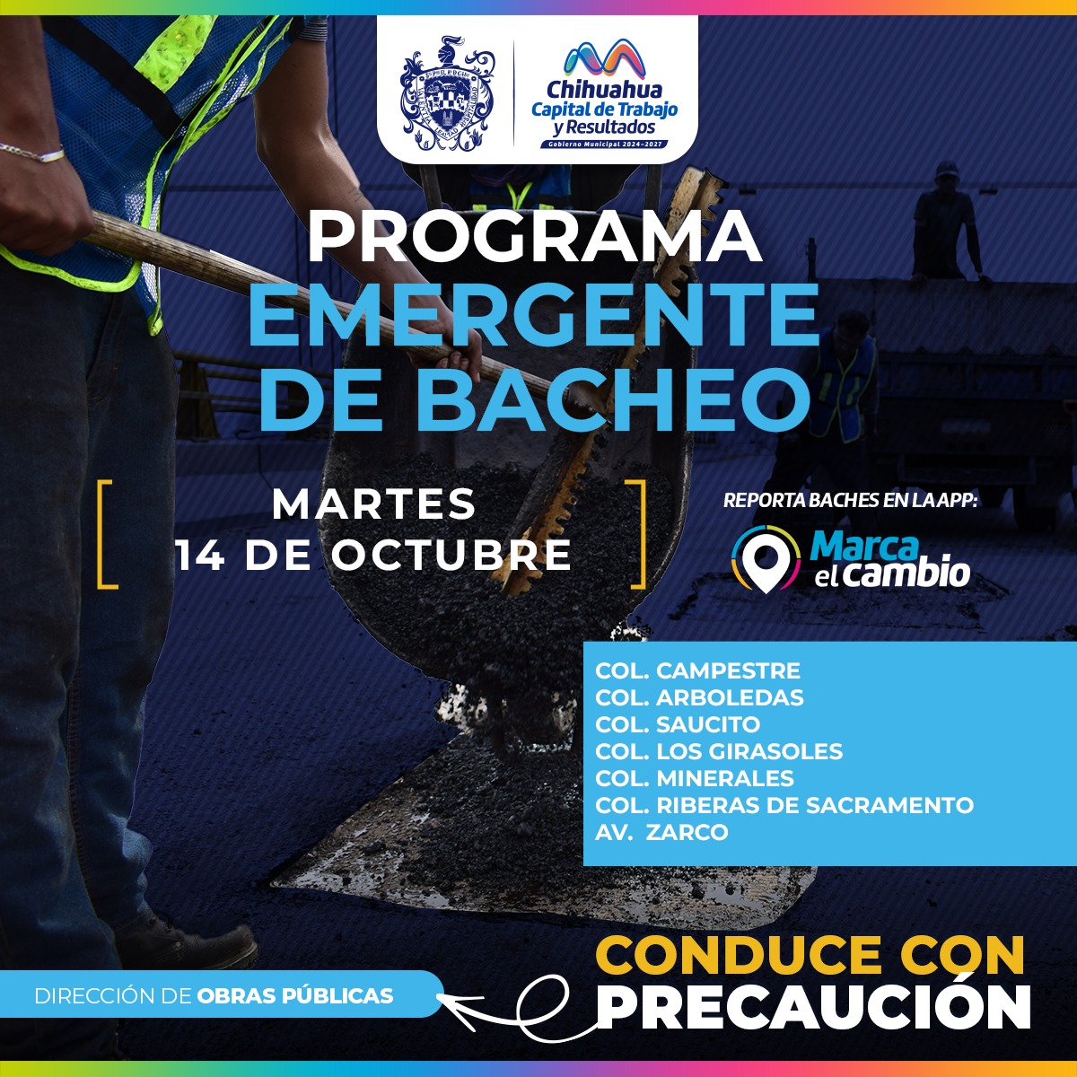 Chihuahua.- El Gobierno Municipal, a través de la Dirección de Obras Públicas, trabajará con bacheo este 13 de octubre, mediante el programa emergente, en calles de las colonias Campestre, Arboledas, Saucito, Los Girasoles, Minerales, Riberas de Sacramento y en la avenida Zarco.