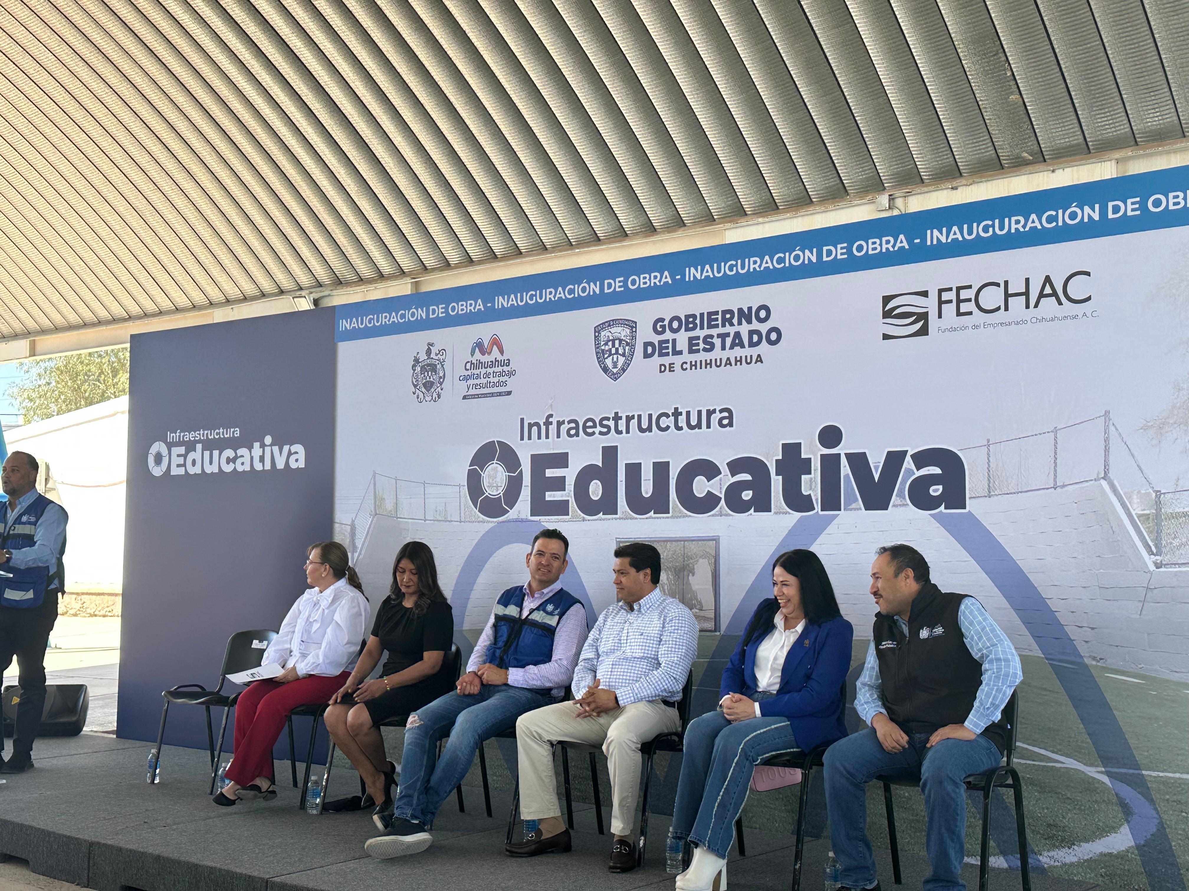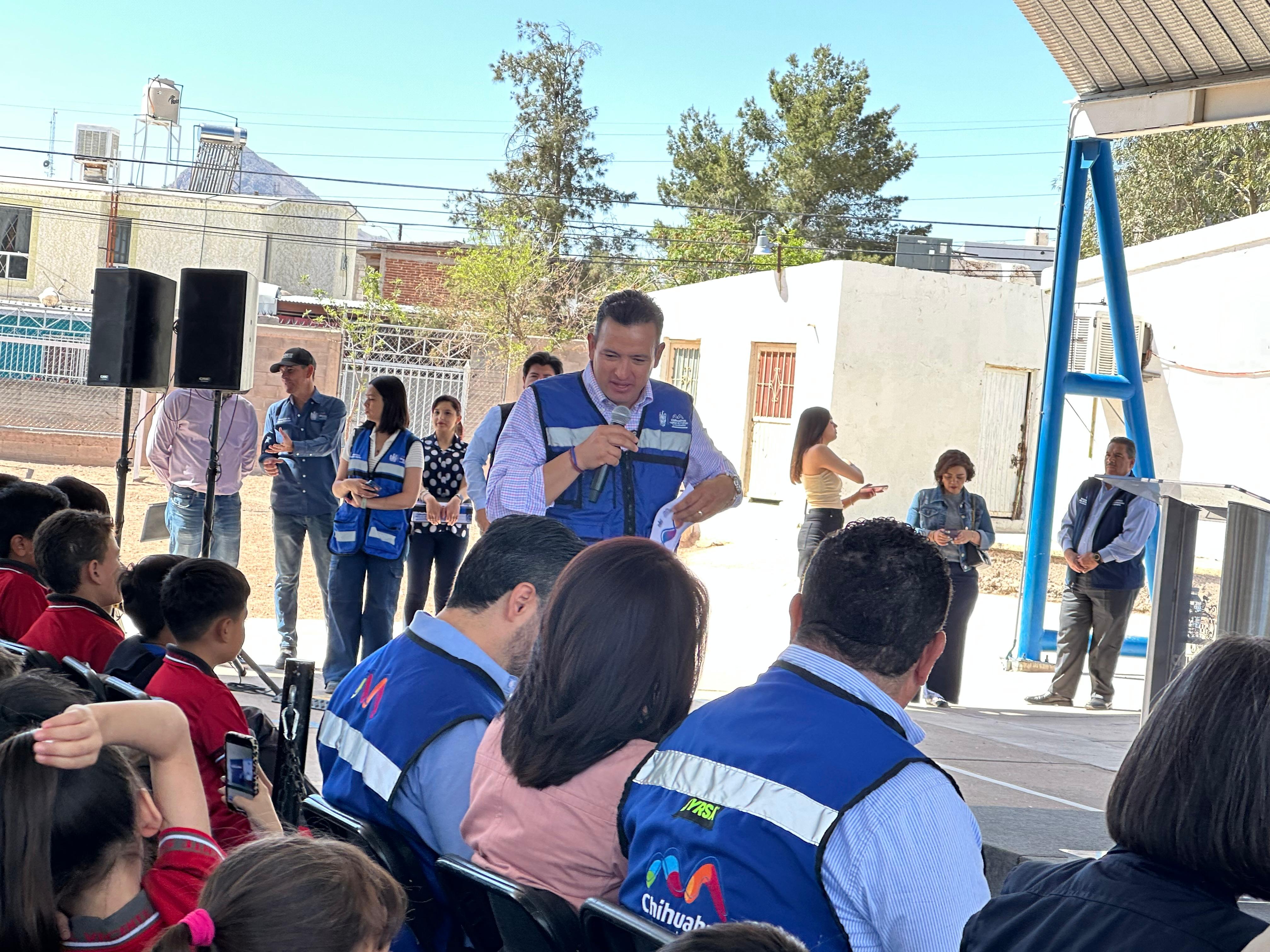 Chihuahua.- El alcalde Marco Bonilla Mendoza encabezó la inauguración de una cancha en la escuela primaria “Vicente Suárez”, obra que fue posible a través del programa Infraestructura Educativa, en alianza con el Gobierno del Estado y FECHAC.