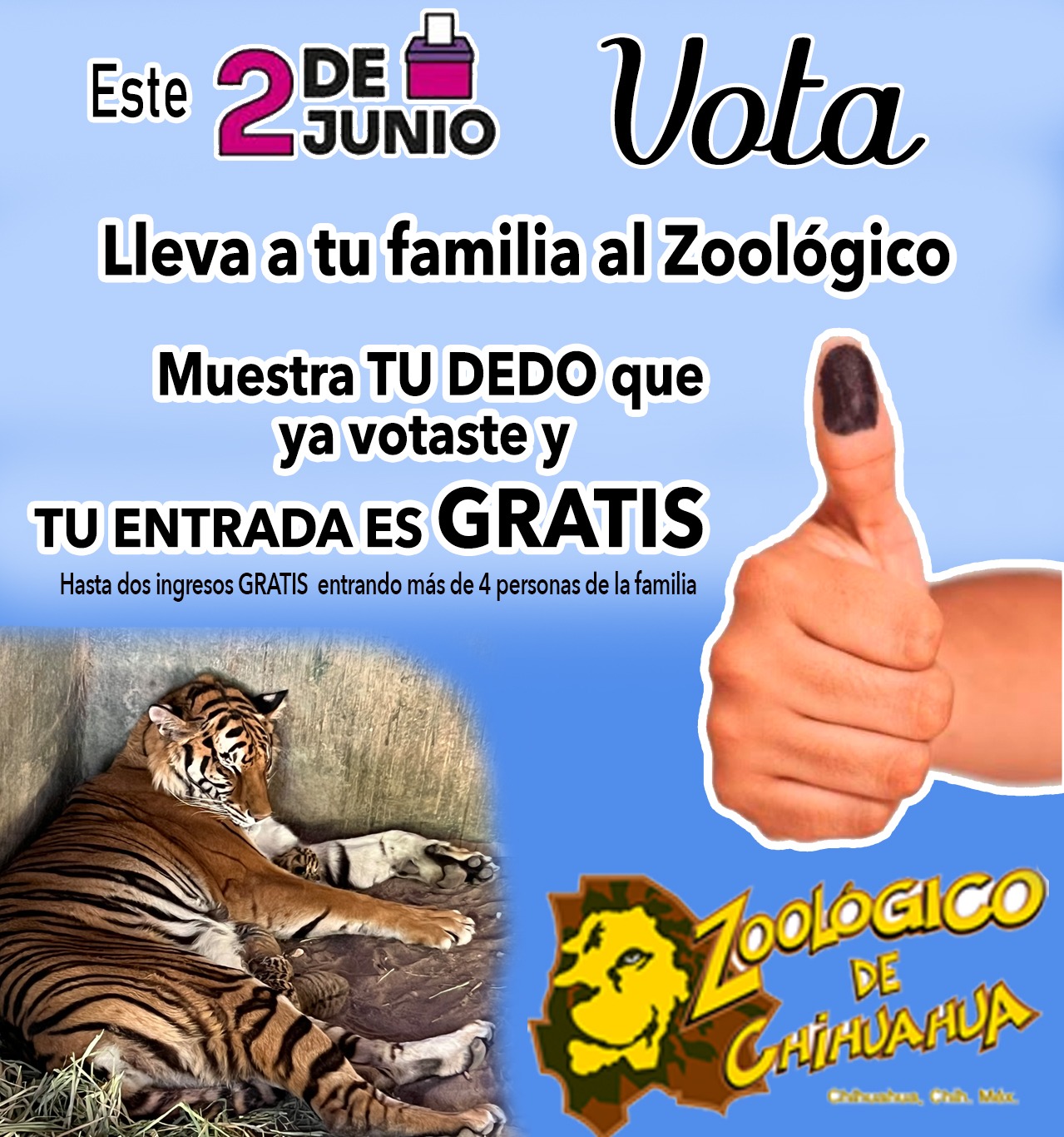 En el Zoológico de Chihuahua sólo se deberá mostrar la huella comprobando que se participó en las votaciones e ir acompañado de la familia, con lo que se obtiene el acceso gratis de una persona, y si son más de cuatro los que acuden a visitar las instalaciones, serán dos quienes puedan entrar gratis, mostrando el dedo entintado, siendo válida la promoción únicamente el 2 de junio de 2024.