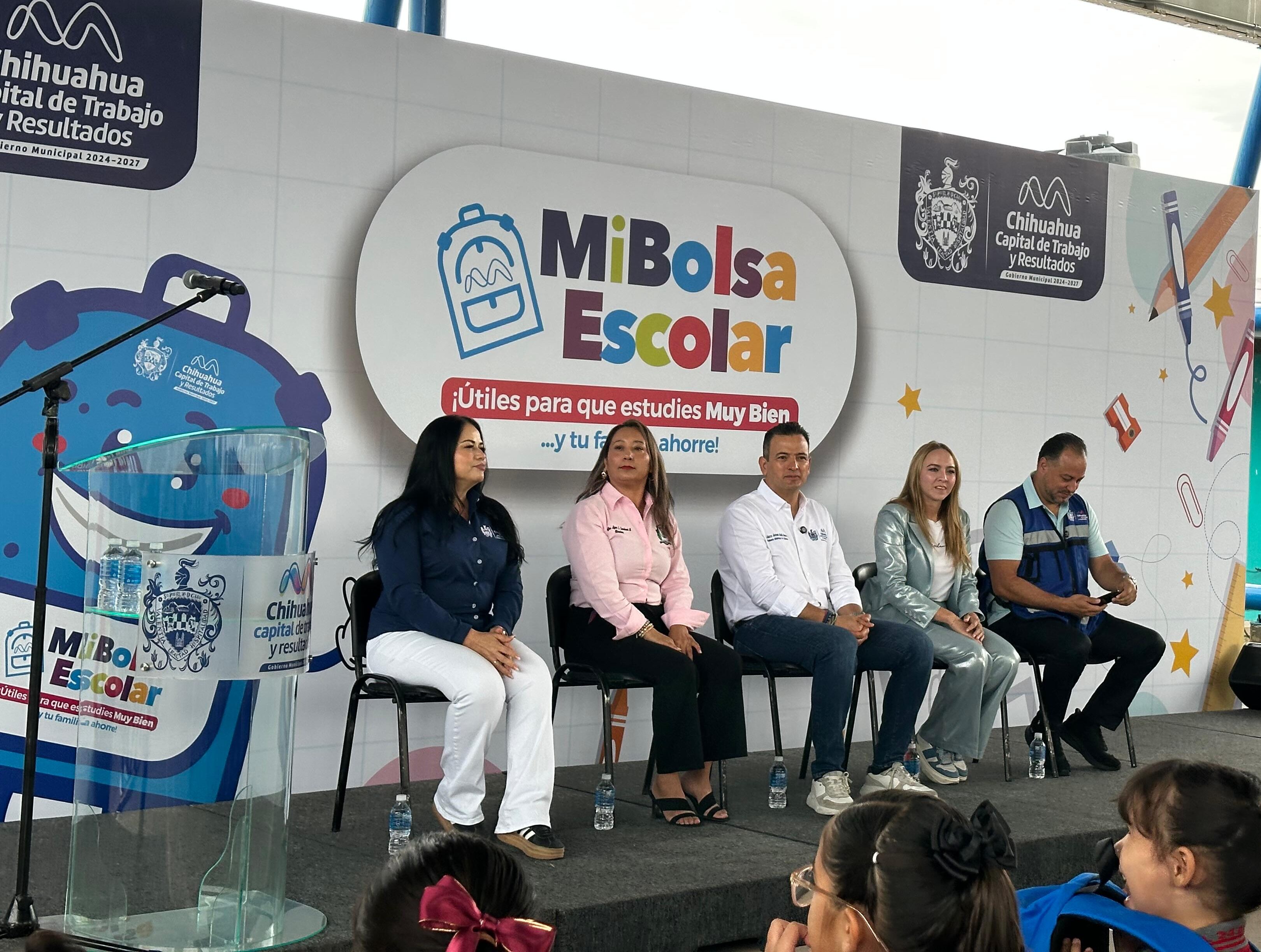 Chihuahua.- Ante el regreso a clases para el ciclo escolar 2025-2026, el alcalde Marco Bonilla Mendoza entregó de manera oficial los kits de “Mi bolsa escolar” en la escuela primaria 24 de febrero,