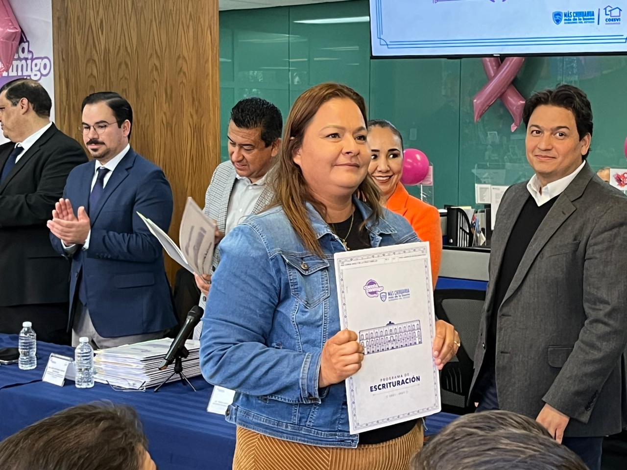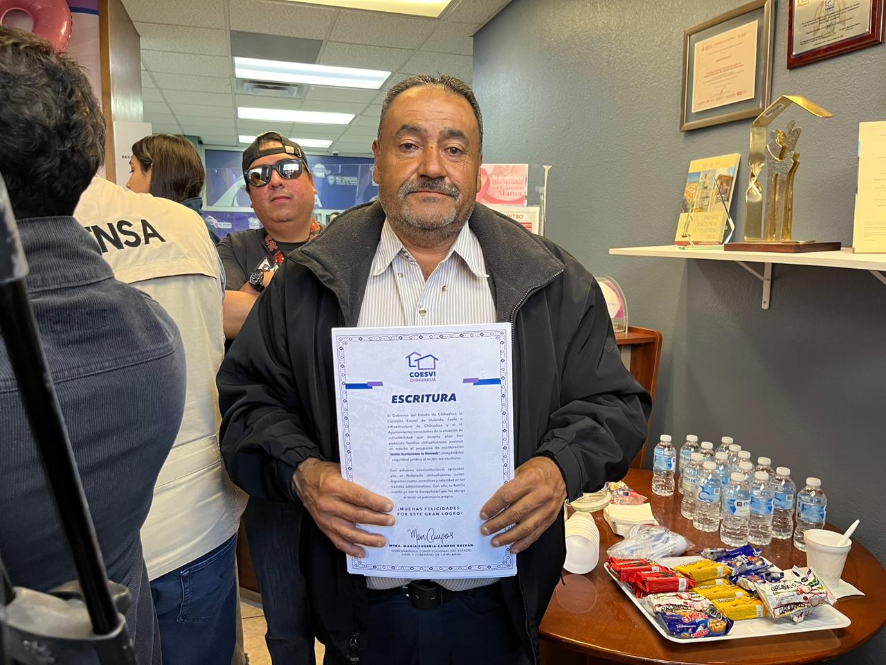 Chihuahua.- La Comisión Estatal de Vivienda, Suelo e Infraestructura (COESVI) entregó 40 escrituras públicas a familias de los municipios de Chihuahua, Aquiles Serdán, Aldama, Cuauhtémoc, Camargo y Juárez, como parte del programa estatal Juntos Escrituramos tu Vivienda, cuyo propósito es brindar certeza jurídica y patrimonial a los poseedores de viviendas.