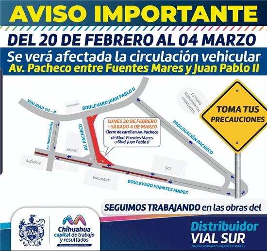 Chihuahua.- El alcalde Marco Bonilla informó que, del 20 de febrero al 4 de marzo, se afectará la circulación por los trabajos del Distribuidor Vial Sur que se realizarán sobre la avenida Pacheco en el tramo que se comprende desde la Juan Pablo II y Vialidad Ch-P hasta la Fuentes Mares, por lo que exhortó a transitar con precaución y tomar rutas alternas.