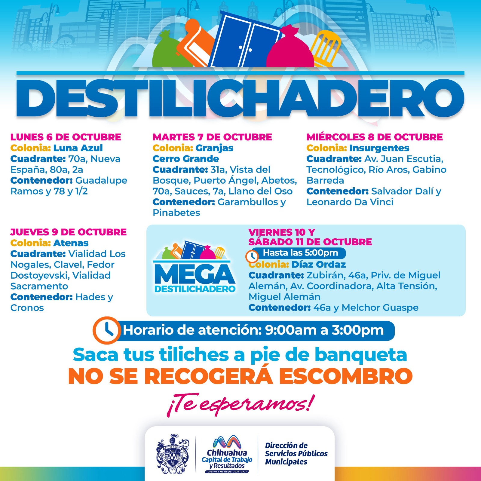 El Destilichadero consiste en retirar basura de grandes dimensiones que el camión recolector no puede trasladar, por lo que se pone a disposición de la población un contenedor en un punto fijo en un horario de 9:00 am a 3:00 pm de lunes a viernes.