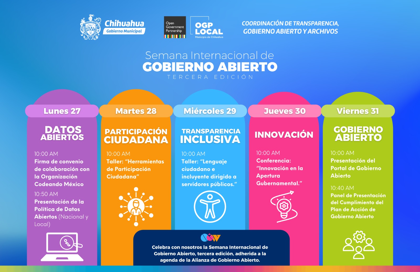 Por ello, el Gobierno Municipal de Chihuahua en colaboración con el Codeando México A.C., el Instituto Nacional Demócrata (NDI), el Instituto Nacional de Transparencia, Acceso a la Información y Protección de Datos Personales (INAI) y el Instituto Chihuahuense para la Transparencia y el Acceso a la Información Pública (ICHITAIP), llevará a cabo diversas actividades que tendrán lugar séptimo piso del Edificio Eloy S. Vallina en punto de las 10:00 am.