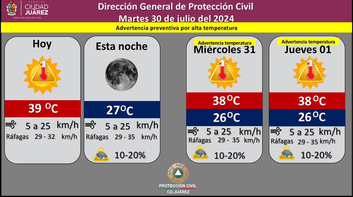 Juárez.- El mes de julio finalizará con altas temperaturas en esta región fronteriza del planeta, ya que el termómetro casi llegará a los 40ºC, como muestra, los 39ºC que se esperan para este martes 30 de julio y los 27ºC como mínima para la noche y madrugada.