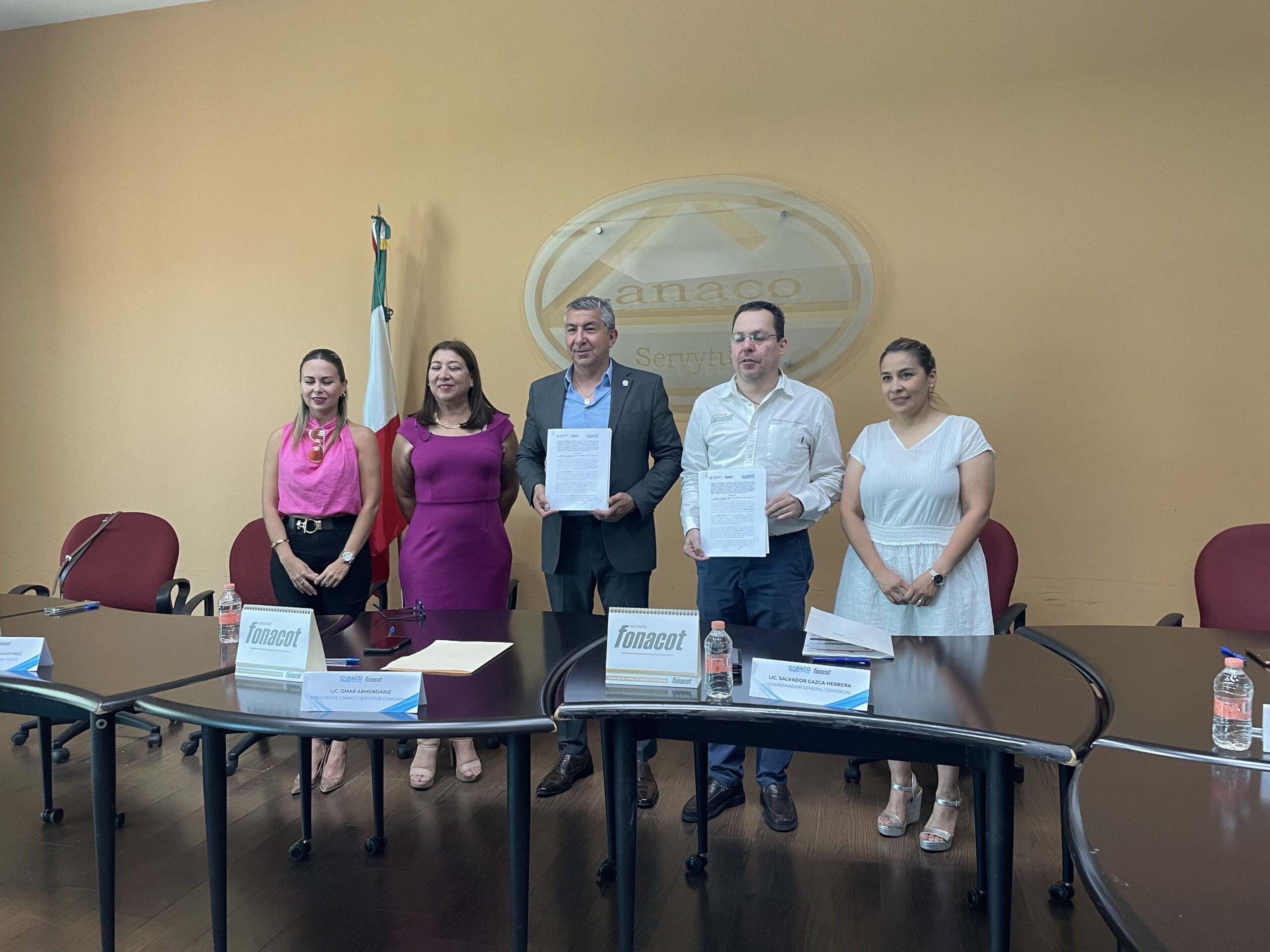 Chihuahua.- El presidente de la Cámara Nacional de Comercio (CANACO) Omar Armendáriz Jurado, encabezó la firma de convenio con representantes del Fondo Nacional para el Consumo de los Trabajadores (FONACOT ) a fin de brindar nuevas alternativas crediticias entre los agremiados para sus trabajadores.