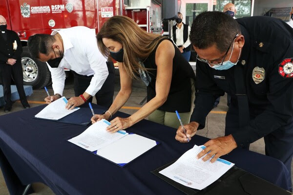 En una ceremonia efectuada en las instalaciones de la Estación de Bomberos número 3 ubicada a un costado de la Comandancia Norte, la Presidenta Municipal acompañada del director de Seguridad Pública Municipal y el Subdirector de Bomberos, fue testigo también de la firma de un convenio de colaboración entre la Escuela de Bomberos “Sergio Arturo Camacho Arrollo” A.C. y la Subdirección del Heroico Cuerpo de Bomberos; a fin de dotar a los bomberos al servicio del municipio de un espacio para realizar entrenamientos especiales de rescate, extinción de fuego, programas académicos y acondicionamiento físico, para la mejora de su rendimiento y desempeño laboral.