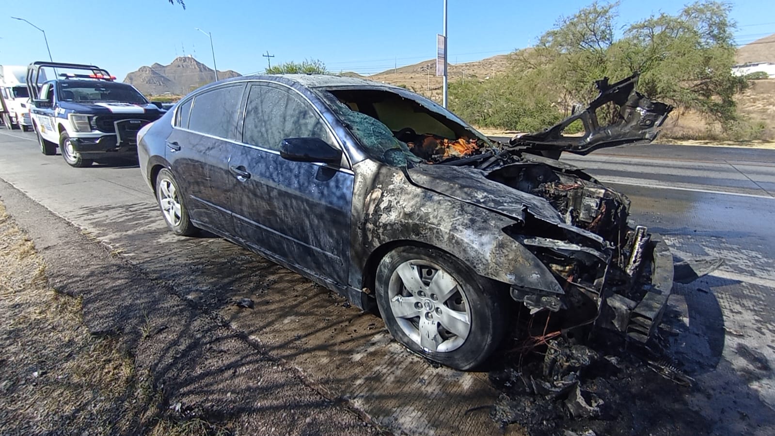 Chihuahua.- Un vehículo Nissan, Altima, de color azul, fue consumido por el fuego en el kilómetro 3.5 de la carretera Chihuahua-Aldama.