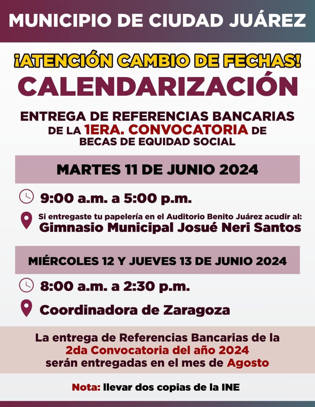 Los beneficiarios podrán acudir con dos copias de la credencial de elector. Para mayor información pueden comunicarse al número (656) 689 9011, de lunes a viernes de 8:30 de la mañana a 2:30 de la tarde.